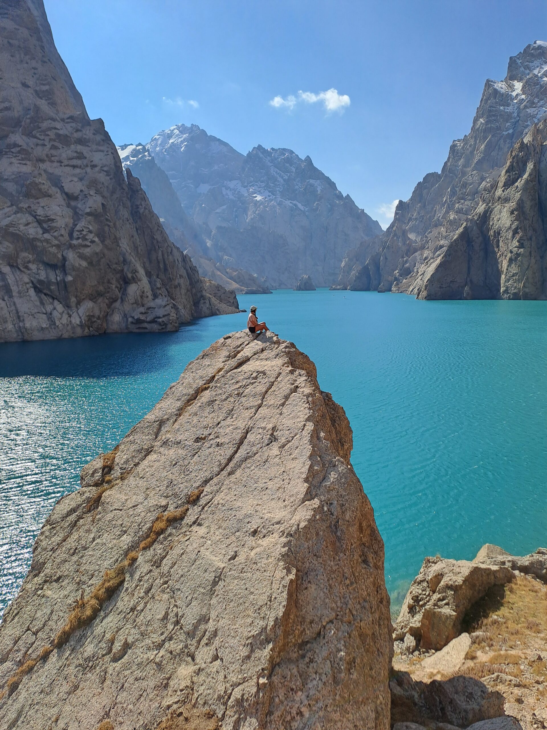 Après ce trek, j’ai décidé de pousser l’aventure encore plus loin, jusqu’à la frontière chinoise. Là-bas se trouve l’un des lacs les plus spectaculaires du pays : Kel-Suu, un joyau turquoise entouré de montagnes déchirées. Il faut un permis spécial pour y accéder, et le trajet jusqu’à ce coin perdu est déjà une aventure. Sur la route, j’ai croisé un voyageur avec qui j’ai partagé les frais — et surtout de bons moments. Aucune romance, juste une belle complicité de route, comme il en naît souvent entre explorateurs. Ensemble, nous avons découvert ce lac absolument grandiose, dans un silence presque sacré. Ce lieu résume à lui seul tout le Kirghizistan : sauvage, immense, indompté.